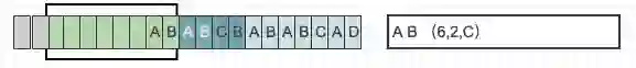 目前从前向缓冲区中可以和滑动窗口中可以匹配的最长短语就是(A,B),然后向前移动的时候再次遇到(A,B)的时候采用标记符代替。