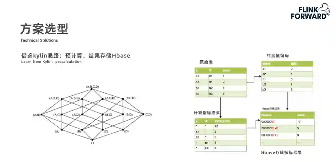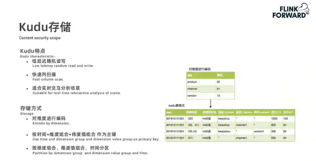 采用 Flink+Kudu 的方案主要思想是借鉴了 Kylin 的思路,Kylin 可以指定很多维度和指标进行离线的预计算然后将预计算结果存储到 HBase 中;快手的方案是通过 Flink 实时计算指标,再实时地写到 Kudu 里面。