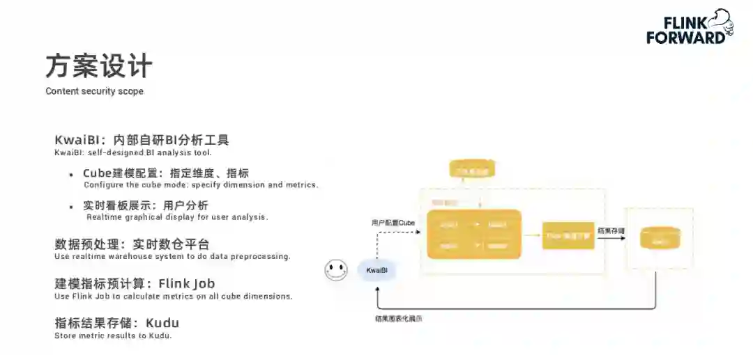实时多维分析的整体的流程为:用户在快手自研的 BI 分析工具 KwaiBI 上配置 Cube 数据立方体模型,指定维度列和指标列以及基于指标做什么样的计算;配置过程中选择的数据表是经过处理过后存储在实时数仓平台中的数据表;然后根据配置的计算规则通过 Flink 任务进行建模指标的预计算,结果存储到 Kudu 中;最后 KwaiBI 从 Kudu 中查询数据进行实时看板展示。