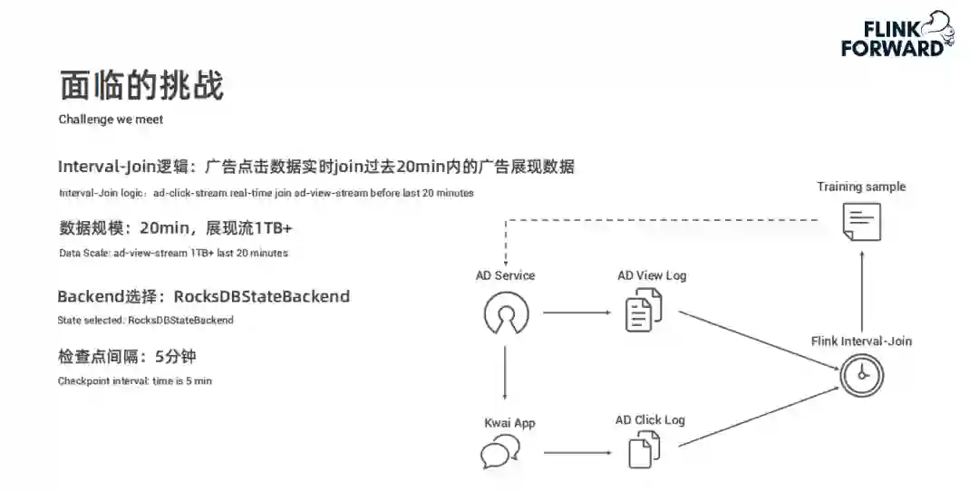 首先看一下 Flink 使用 RocksDB 遇到的问题,先阐述一下快手的应用场景、广告展现点击流实时 Join 场景:打开快手 App 可能会收到广告服务推荐的广告视频,用户可能会点击展现的广告视频。这样的行为在后端会形成两份数据流,一份是广告展现日志,一份是客户端点击日志。这两份数据进行实时 Join,并将 Join 结果作为样本数据用于模型训练,训练出的模型会被推送到线上的广告服务。该场景下展现以后20分钟的点击被认为是有效点击,实时 Join 逻辑则是点击数据 Join 过去20分钟内的展现。其中,展现流的数据量相对比较大,20分钟数据在 1TB 以上。检查点设置为五分钟,Backend 选择 RocksDB。