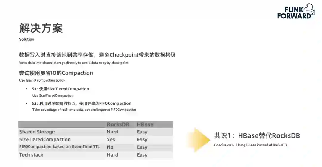 由于出现上文阐述的问题,开始寻找解决方案,整体思路是在数据写入时直接落地到共享存储中,避免 Checkpoint 带来的数据拷贝问题。手段是尝试使用更省 IO 的 Compaction,例如使用 SizeTieredCompation 方式,或者利用时序数据的特点使用并改造 FIFOCompaction。综合比较共享存储、SizeTieredCompation、基于事件时间的 FIFOCompaction 以及技术栈四个方面得出共识:HBase 代替 RocksDB 方案。