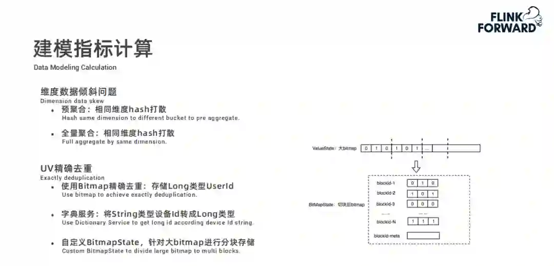 再重点介绍下,建模指标计算中的几个关键点。在建模指标计算中,为了避免维度数据倾斜问题,通过预聚合 ( 相同维度 hash 打散 ) 和全量聚合 ( 相同维度打散后聚合 ) 两种方式来解决;为了解决 UV 精确去重问题,前文有提到,使用 Bitmap 进行精确去重,通过字典服务将 String 类型数据转换成 Long 类型数据进而便于存储到 Bitmap 中,因为统计 UV 要统计历史的数据,比如说按天累计,随着时间的推移,Bitmap 会越来越大,在 Rocksdb 状态存储下,读写过大的 KV 会比较耗性能,所以内部自定义了一个 BitmapState,将 Bitmap 进行分块存储,一个 blockid 对应一个局部的 bitmap,这样在 RocksDB 中存储时,一个 KV 会比较小,更新的时候也只需要根据 blockid 更新局部的 bitmap 就可以而不需要全量更新。