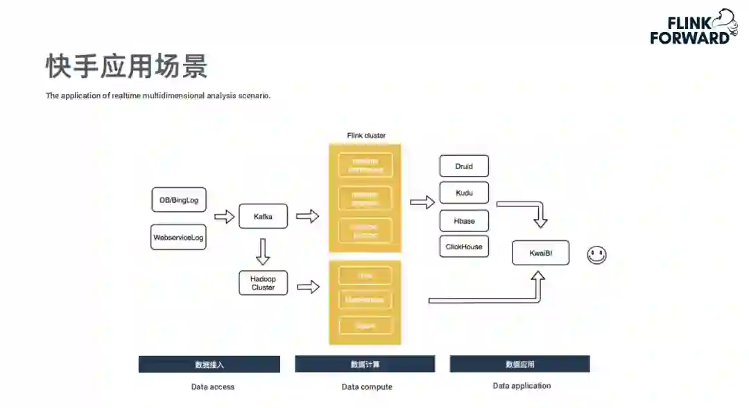 快手计算链路是从 DB/Binlog 以及 WebService Log 实时入到 Kafka 中,然后接入 Flink 做实时计算,其中包括实时数仓、实时分析以及实时训练,最后的结果存到 Druid、Kudu、HBase 或者 ClickHouse 里面;同时 Kafka 数据实时 Dump 一份到 Hadoop 集群,然后通过 Hive、MapReduce 或者 Spark 来做离线计算;最终实时计算和离线计算的结果数据会用内部自研 BI 工具 KwaiBI 来展现出来。