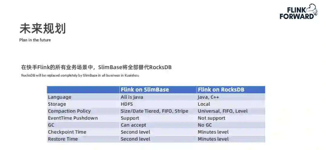 从语言、存储、压缩策略、事件事件下推、垃圾回收、检查点时间、重加载时间七个方面来看,SlimBase 都比 RocksDB 更适合快手实时计算任务的开发,未来的规划是对 SlimBase 的性能做进一步优化,愿景是将快手 Flink 上的所有业务场景全部用 SlimBase 替代掉 RocksDB。