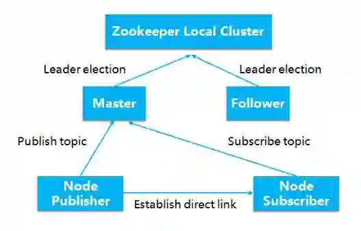 另一个思路是ROS Master 这个关键节点采取备份机制,如果ROS Master 宕机了,备份节点会顶上,可以采用开源的分布式协调框架zookeeper 去完成这个功能,见下图: