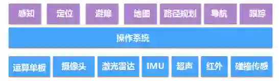 感知、定位、避障、地图、路径规划、导航、跟踪是封装的软件算法模块,软件算法与感知单元采集的数据配合,完成机器人的各种功能。