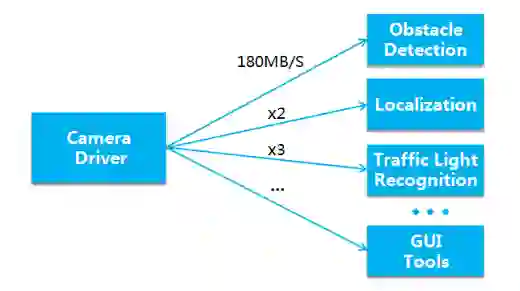 它对于带宽资源是十分敏感的,以摄像头传感器为例,因为自动驾驶要高速行驶,采样率要高,至少每秒30帧, 以1080P的像素计算,大概为 180M/S,而且传感器的数据不只一个节点感兴趣,见下图: