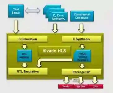 鉴于此,HLS开发方式应运而生,HLS即高层次描述(High Level Synthesis),之后综合成可用的网表文件的技术。这里的“高”指采用C/C++进行编程,而不是传统的Verilog和VHDL语言。Vivado工具将C程序转换成Verilog代码后,进行综合、优化、布局布线等操作。开发流程图如下: