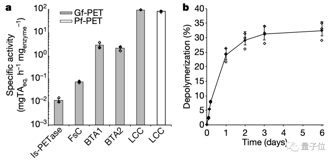 前人提出的水解酶,20小时内能消化一半的PET。而在这项工作中,只需要15个小时,消化率就能达到85%。