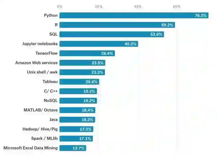 根据数据平台 Kaggle 发布的2017 机器学习及数据科学调查报告,在工具语言使用方面,Python是使用最多的语言。