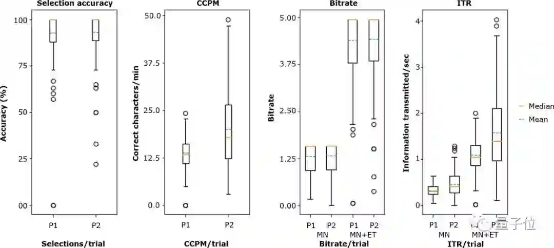 测试考量了几个指标,包括点击选择准确性、每分钟正确字符数和信息传输速率,并且在试验之间计算了描述性统计。