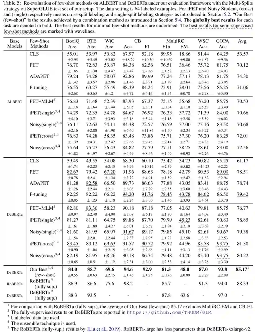 结论2: 不同小样本学习方法的增益在很大程度上是互补的。通过将目前各种先进方法组合,它们可以实现优于任意单一方法的小样本学习性能。目前最佳组合方法的小样本学习性能,接近 RoBERTa上实现的全监督性能;但和目前 DeBERTa 上实现的最优全监督性能相比,它仍然存在较大的差异性。