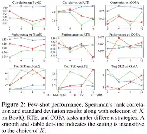 对小样本自然语言评价体系的衡量,我们提出衡量小样本评价体系的关键性指标,分别是:最终测试集小样本学习性能、测试集和验证集关于一个超参数空间分布的相关性、以及稳定性。同时我们以量化实验的方式,对几种候选的评价策略进行比较以论证其有效性。已有实验结果如下,可以看出,多次数据划分(Multi-Splits)是比 K 折交叉验证(CV)和最短描述距离(MDL)更好的数据拆分策略。