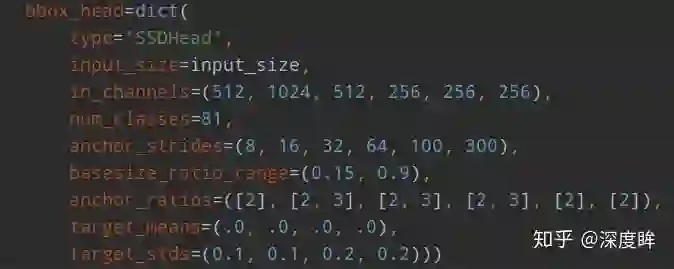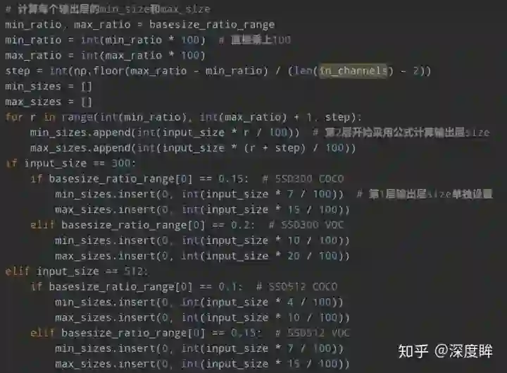 可以看出,ssd一共包括6个尺度输出,每个尺度的strides可以从anchor_strides中看出来,basesize_ratio_range表示正方形anchor的min_size和max_size,anchor_ratios表示每个预测层的anchor个数,以及比例。有点绕,下面具体分析。为了方便设置anchor,作者设计了一个公式来生成anchor,具体为: