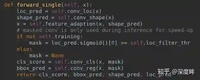 左边是GARetinaHead,右边是RetinaHead,可以看出配置除了loss有区别外,都是一样的。head部分的forward非常简单,和retinanet相比就是多了两个shape_pred, loc_pred分支: