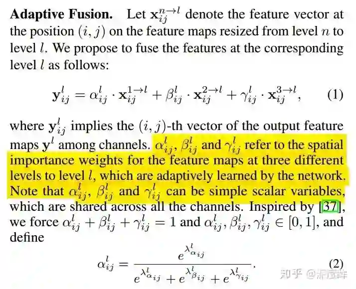 简要思想就是:原来的FPN add方式现在变成了add基础上多了一个可学习系数,该参数是自动学习的,可以实现自适应融合效果,类似于全连接参数。ASFF具体操作包括 identically rescaling和adaptively fusing。定义FPN层级为l,为了进行融合,对于不同层级的特征都要进行上采样或者下采样操作,用于得到同等空间大小的特征图,上采样操作是1x1卷积进行通道压缩,然后双线性插值得到;下采样操作是对于1/2特征图是采样3 × 3 convolution layer with a stride of 2,对于1/4特征图是add a 2-stride max pooling layer然后引用stride 卷积。Adaptive Fusion