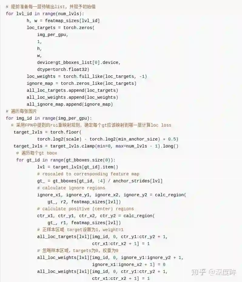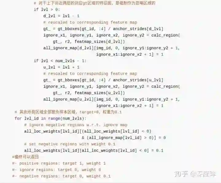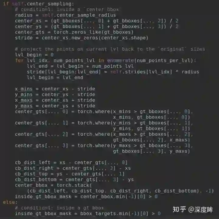 如果需要进行中心采样,那么基于采样半径比例×当前stride的范围内都属于正样本inside_gt_bbox_mask,其余样本全部属于负样本。可能很多人都有疑问:为啥不需要设置忽略区域?个人猜测原因可能是:1. 设置忽略区域,又需要增加一个超参;2.多了一个center-ness分支,可以很大程度抑制这部分区域对梯度的影响。3.间接的增加了正样本数目。不管咋说应该是作者实验后发现没有很大必要吧。