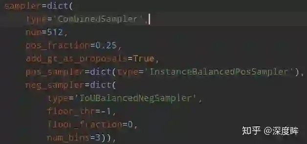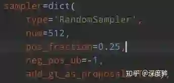 注意libra rcnn的正负样本采样规则修改仅仅是对于rcnn而言,对于rpn head没有任何修改,依然是随机采样器。原因是作者的主要目的是为了涨点mAP,作者认为rpn涨几个点对最终bbox 预测map没有多大帮助,因为主要是靠rcnn部分进行回归预测才能得到比较好的mAP。其参数如下: