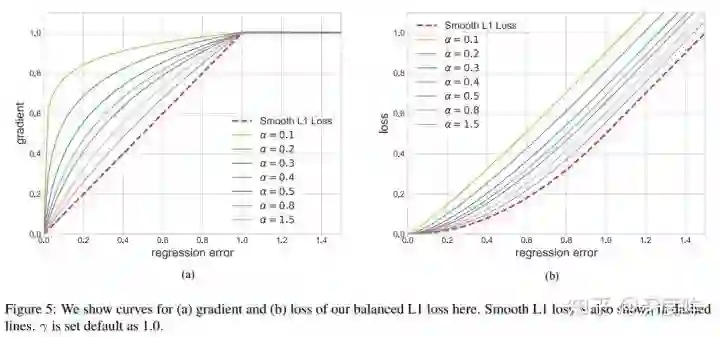 原始的faster rcnn的rcnn head,使用的回归loss是smooth l1,作者认为这个依然存在不平衡。作者分析是:loss解决Classification和Localization的问题,属于多任务loss,那么就存在一个平衡权重,一般来说回归权重会大一些,但一味的提高regression的loss其实会让outlier的影响变大(类似于OHEM中的noise label),outlier外点样本这里作者认为是样本损失大于等于1.0,这些样本会产生巨大的梯度不利于训练过程,小于的叫做inliers。平衡回归loss的目的是既不希望放大外点对梯度的影响,又要突出内点中难负样本的梯度,从而实现对外点容忍,对内点区分难负样本的作用。为此作者在smooth l1的基础上进行重新设计,得到Balanced L1 Loss。核心操作就是想要得到一个当样本在 附近产生稍微大点的梯度的函数。首先smooth l1的定义如下: