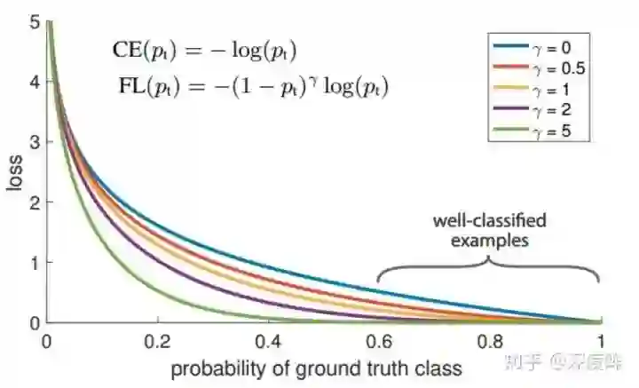 上面的公式表示label必须是one-hot形式。只看图示就很好理解了,对于任何一个类别的样本,本质上是希望学习的概率为1,当预测输出接近1时候,该样本loss权重是很低的,当预测的结果越接近0,该样本loss权重就越高。而且相比于原始的CE,这种差距会进一步拉开。由于大量样本都是属于well-classified examples,故这部分样本的loss全部都需要往下拉。其简单思想版本如下: