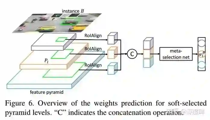 引入一个简单的网络来学习金字塔权重,具体做法是:利用gt bbox,映射到对应的特征图层,然后利用roialign层提出特征,在采用简单的分类器输出每个层级的权重。由于金字塔层数是5,故fc的输出是5。label设置上,这个思想的提出是参考FSAF(Feature Selective Anchor-Free Module for Single-Shot Object Detection)的做法,核心思想是不再人为定义具体是哪一层负责预测GT,而是根据loss最小的动态选择的那个层。本文借鉴上述思想,也是自动选择最适合的层。meta选择网络的独热码label不是人为提前计算好的,而是根据输出softmax层的值或者说loss来选择的,哪个输出节点loss最小,那么Label就设置为1,其余为0。整个meta选择网络和目标检测网络联合训练。