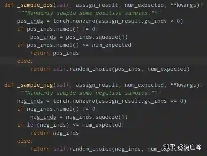 步骤2可以区分正负和忽略样本,但是依然存在大量的正负样本不平衡问题,解决办法可以通过正负样本采样或者loss上面一定程度解决,faster rcnn默认是需要进行正负样本采样的。rpn head和rcnn head的采样器都比较简单,就是随机采样,阈值不一样而已。rpn head采样器: