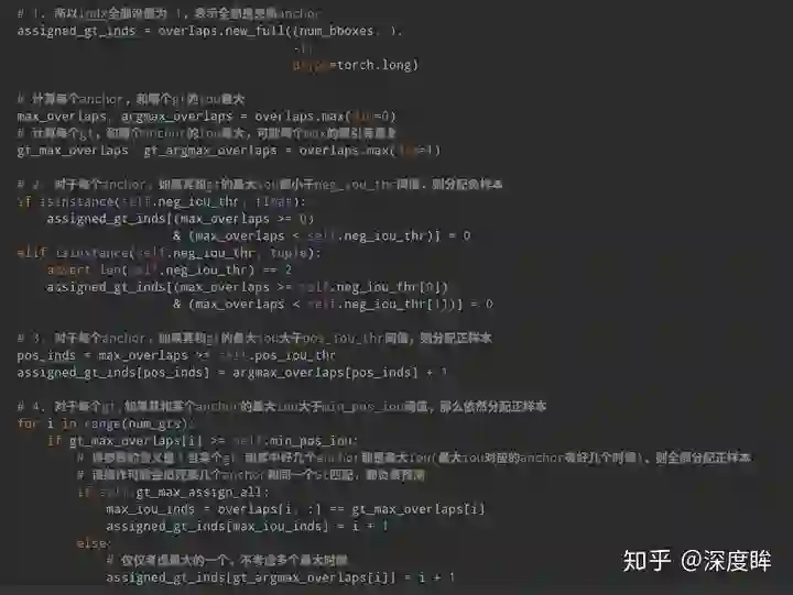 简单总结来说就是:如果anchor和gt的iou低于neg_iou_thr的,那就是负样本,其应该包括大量数目;如果某个anchor和其中一个gt的最大iou大于pos_iou_thr,那么该anchor就负责对应的gt;如果某个gt和所有anchor的iou中最大的iou会小于pos_iou_thr,但是大于min_pos_iou,则依然将该anchor负责对应的gt;其余的anchor全部当做忽略区域,不计算梯度。该最大分配策略,可以尽最大程度的保证每个gt都有合适的高质量anchor进行负责预测,