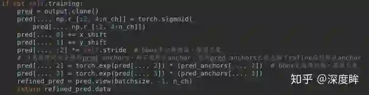 对ASFF层输出的每一层特征图xin,进行GA分支推理,并且经过Feature_adaption,得到最终的bbox预测输出output,由于wh预测肯定是大于0的,故作者采用了exp函数强制大于0.此时就得到了**wh_pred(batch,4,2,h,w)和output(batch,4,5+class,h,w)**。