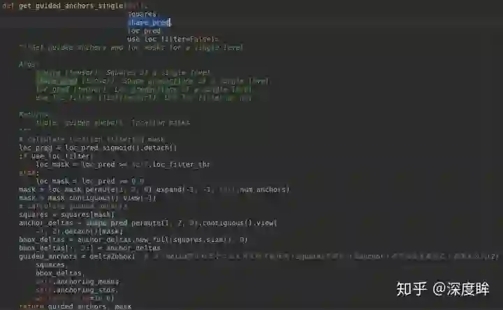 可以明显发现approx_generators是每个位置9个anchor,而square_generators每个位置是1个anchor,且是正方形。为了方便区分,你可以认为squares_list存储的就是每一层的还原基数而已,和anchor没啥关系的,只不过可以等价实现而已。而guided_anchors_list其实就是在squares_list基础上结合loc预测和shape预测得到的动态anchor,用于训练原始的retinanet的分类和回归分支。而如何利用squares_list、loc_pred和shape_pred得到最终的动态anchor,做法非常简单,如下所示(测试阶段也是这个流程):