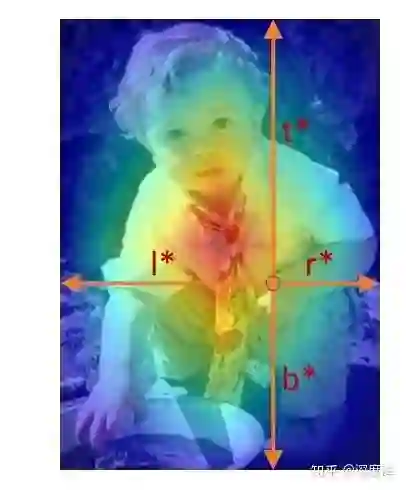 考虑到anchor free预测值和anchor base不一样,故还是需要提前说下网络预测形式。FCOS是全卷积预测模式,对于cls分支,输出是h x w x (class+1),每个空间位置值为1,表示该位置有特定类别的gt bbox,对于回归分支,输出是h x w x 4,其4个值的含义是: