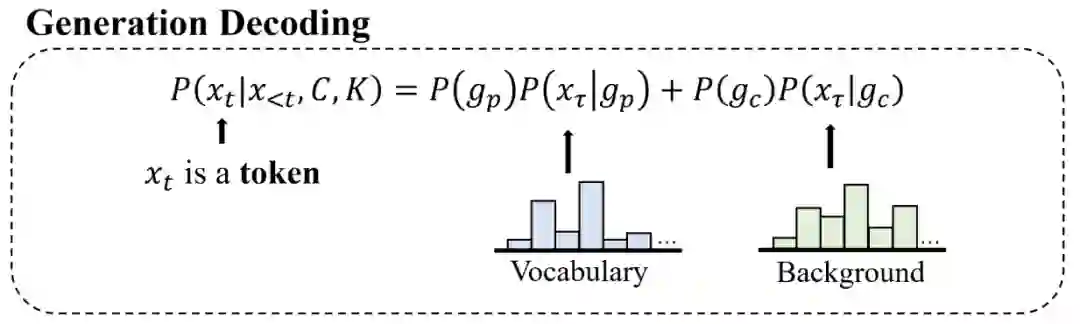 模型将通过生成预测解码(从预先定义的词表中预测一个词)和生成拷贝解码(从背景知识中拷贝一个词)来共同决定