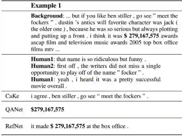 在这个样例中,RefNet 成功定位并抽取了语义单元“$279,167,575”,并将其与自然的描述“it made”与“at the box office”进行合理地组合构成最终的回复。QANet 抽取了正确的语义单元,但是回复内容非常生硬;Cake 定位了错误的背景知识。