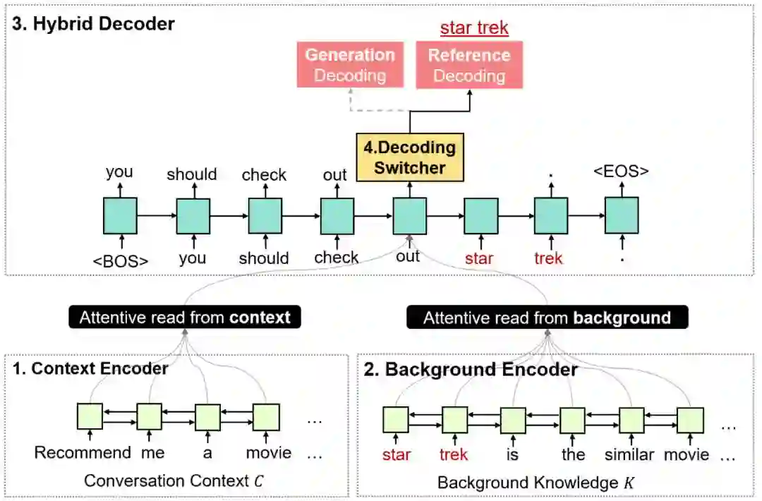 如图 6 所示,RefNet 包含了四个模块,分别为:知识编码器(Background Encoder)、语境编码器(Context Encoder)、解码选择器(Decoding Switcher)、混合解码器(Hybrid Decoder)。