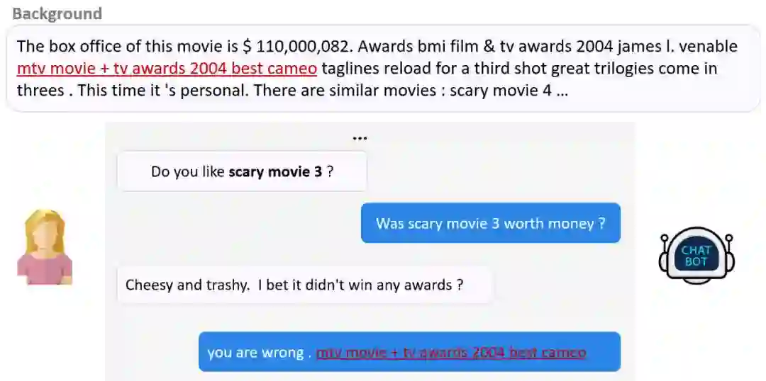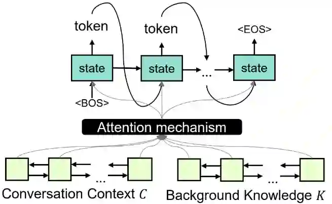 近些年来,有些研究通过改进目标函数或者引入话题信息来尝试解决这一问题,也有研究通过引入背景知识来解决这一问题,我们称之为基于背景知识的对话。如图 2 所示,其任务目标为同时基于外界背景知识与对话上下文,生成自然、高信息量的回复。
