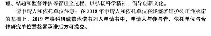 为贯彻落实《关于进一步加强科研诚信建设的若干意见》的要求,在2018年申请人和依托单位在线签署维护公正性承诺的基础上,2019年将科研诚信承诺书列入申请书中,申请人与参与者、依托单位与合作研究单位需签署承诺后方可提交。