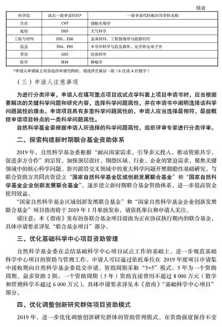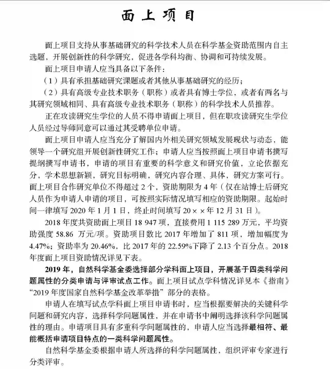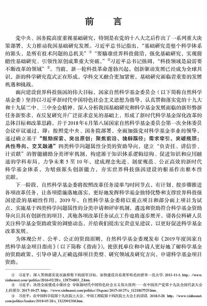 《2019年国家自然科学基金项目指南》,根据《国家自然科学基金条例》和项目管理办法等相关文件,发布了括2019年度国家自然科学基金改革举措、申请须知和限项申请规定以及各类资助政策,指导申请人自主选题、申请国家自然科学基金的资助。《指南》对探索项目系列、人才项目系列、工具项目系列、融合项目系列等各类项目分别进行介绍,是国家自然科学基金资助工作的重要依据,也是国家自然科学基金申请人必读的参考文献。