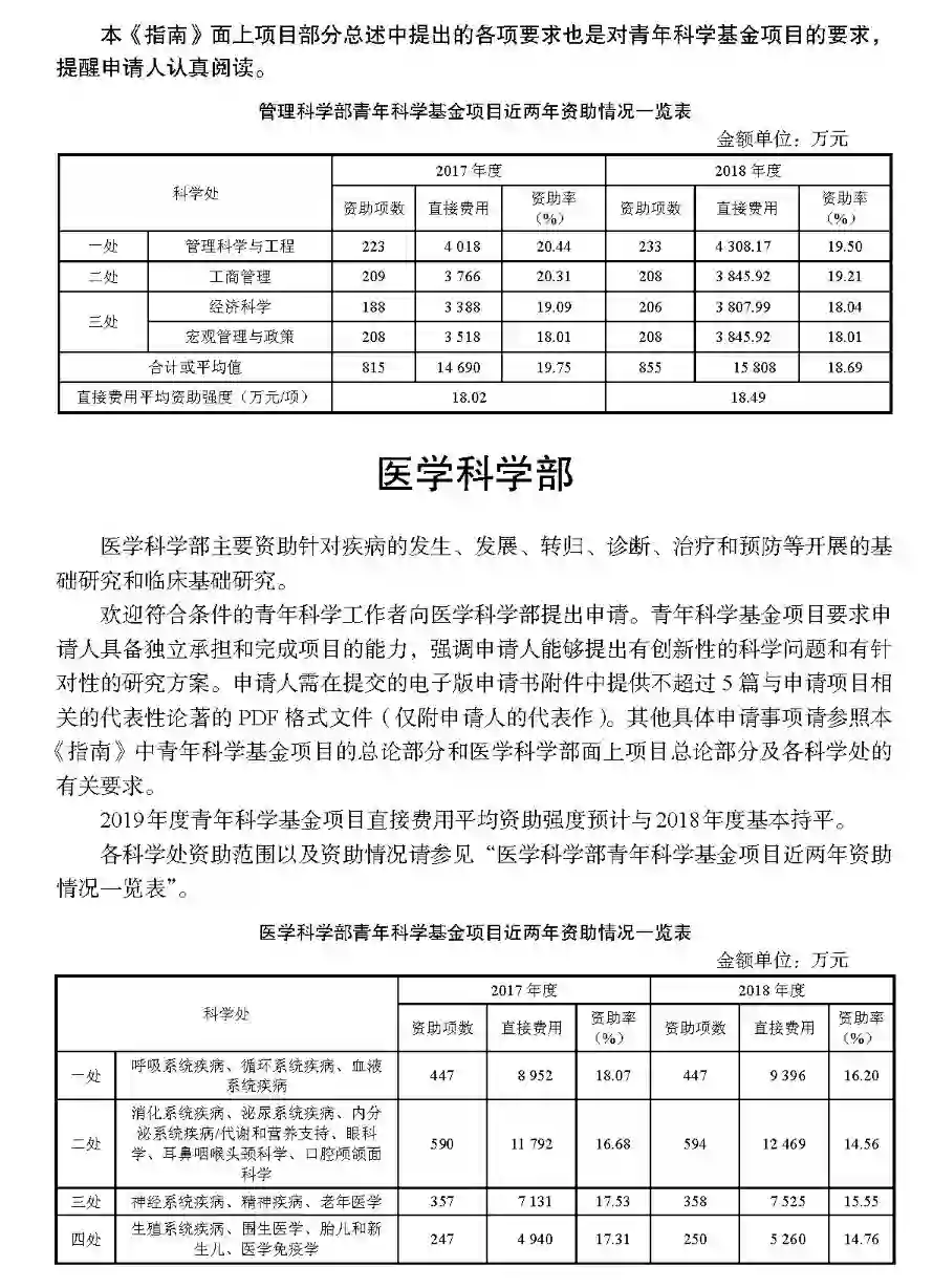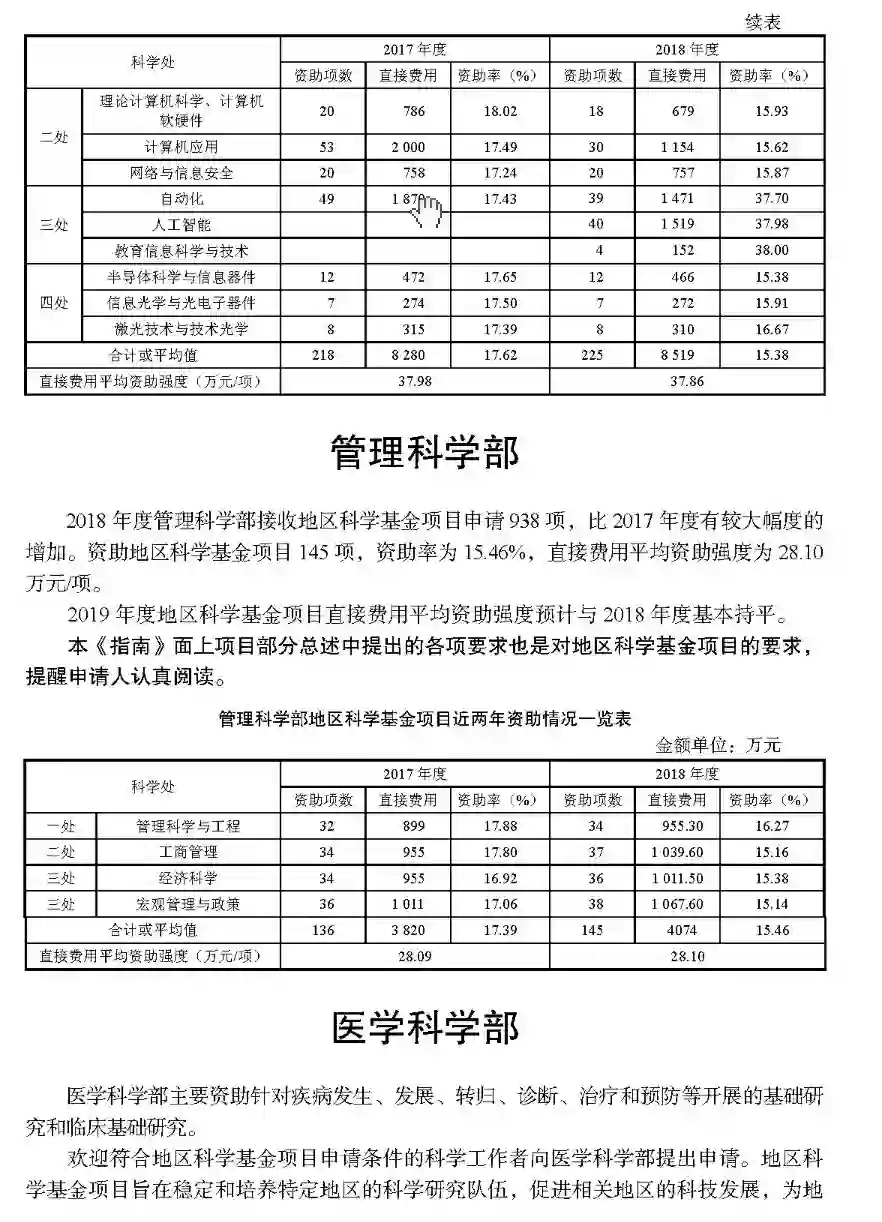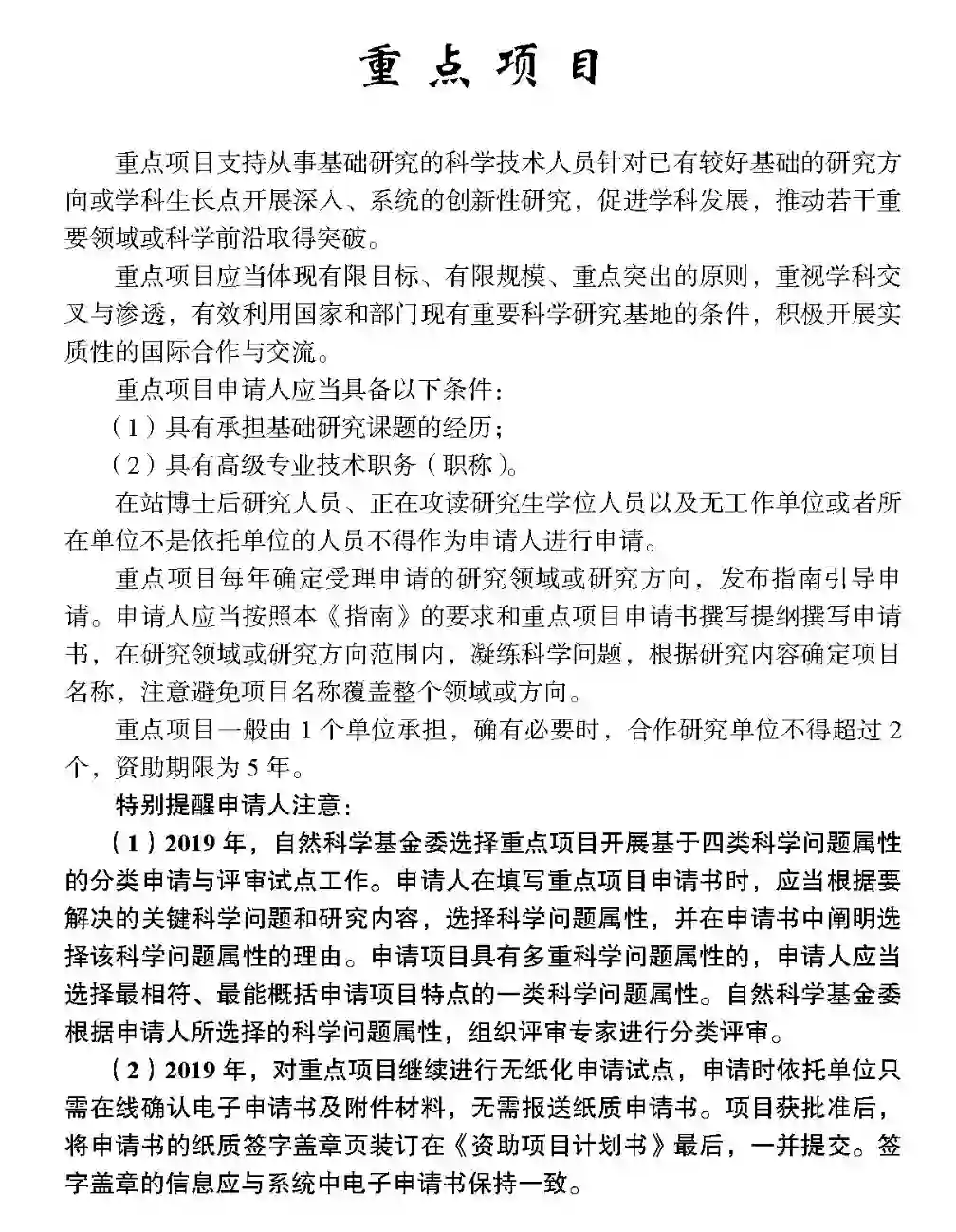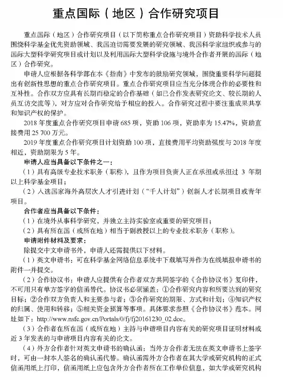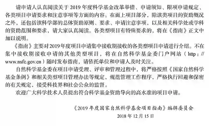 【导读】近日,国家自然科学基金委员会在其官网上发布了2019年项目指南,项目指南共344页,内容包括2019年国家基金委改革的一系列举措、申请须知、申请项目的限项规定,以及各类项目的申请指南等重要内容。是高等学校、科研院所等机构从事科学研究工作的科研人员,以及参与科技管理的科技政策研究的人员的重大参考。