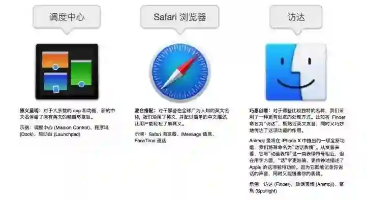 而类似 Finder、Clips 这类专有名词,苹果则通过意译的办法,翻译成「访达」和「立可拍」,一方面贴近英文发音,又传达出功能的含义。