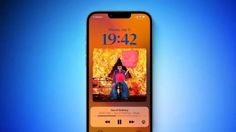 在最新的iOS 16测试版中,专辑画面显示在前面和中央,下方有一个单独的更小的音乐播放器用于控制播放。专辑画面决定了锁屏的背景颜色,但如果您在显示屏底部点击,则可以返回到标准墙纸并最小化播放器。