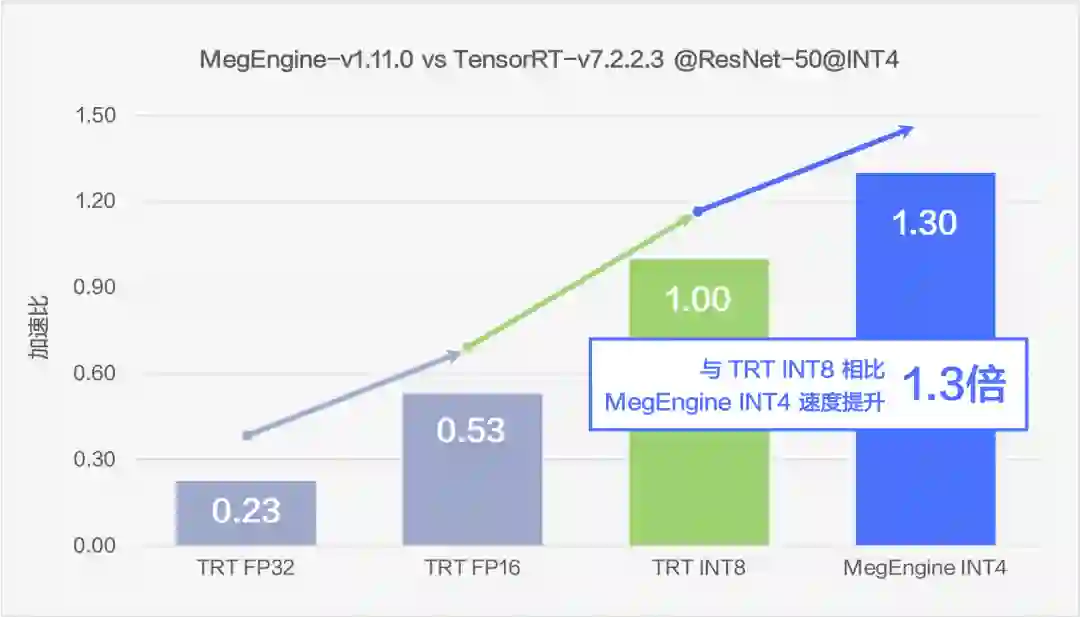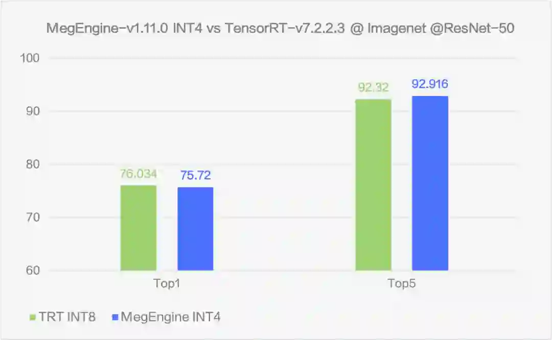 因此量化模型被广泛使用在推理侧,量化也成为了一个重要且非常活跃的研究领域。近期,MegEngine 开源了 4 bits 的量化的相关内容,通过 MegEngine 4 bits 量化实现的 ResNet-50 模型在 ImageNet 数据集上的精度表现与 8 bits 量化模型相差无几,并且速度是 TensorRT-v7 8 bits ResNet-50 模型的推理速度的 1.3 倍。这次实践为 MegEngine 积累了 4 bits 量化的相关经验。同时,MegEngine 决定将 4 bits 量化的相关代码开源,为大家提供可参考的完整方案,推动在更低比特推理领域的探索与发展。