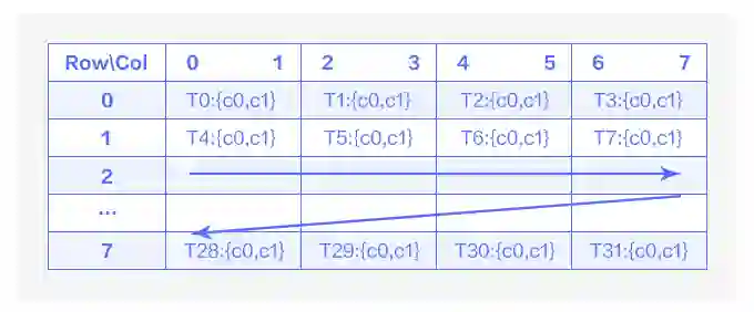 如图 6 中所示,在一次 mma 指令运算中,一个 warp 的 32 个线程负责 64 个运算结果,且这些结果都存储在寄存器上。每个线程负责 8x8 的结果矩阵同一行内连续的两个运算结果,每四个线程负责同一行的 8 个运算结果。