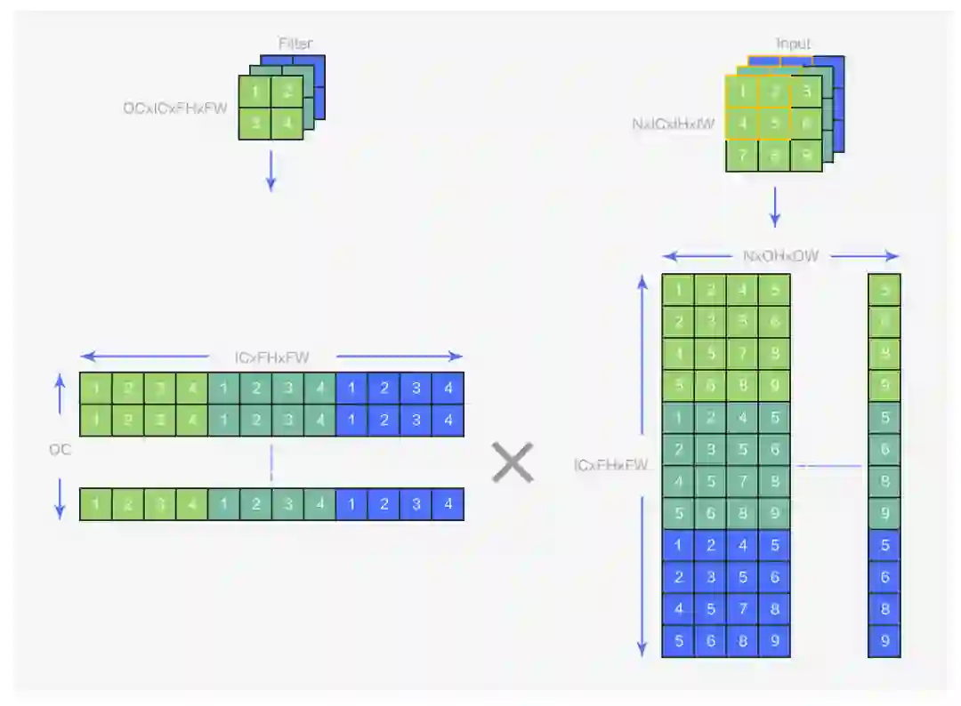 conv 采用 implicit gemm 算法并通过 mma 指令调度 tensor core 进行计算加速。顾名思义,implicit gemm就是将 conv 运算转换为矩阵乘的一种算法,是对 img2col 的算法的改进,传统的 img2col 算法如下:
