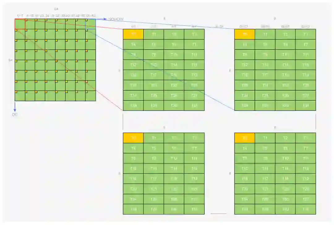一个 warp 负责 64x64 大小的输出矩阵,该矩阵由 8x8 个 mma 的 8x8 输出矩阵组成,输出和线程的排布关系如图所示,黄色部分表示线程 0 所拥有的数据。图 7 中的所有数据都在寄存器上,算子的最后一步操作,也就是将这些数据写回到 global memory 上并按照 NCHW64 的方式进行排布。