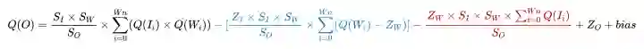 在上述公式中,ZI、ZW 是否等于 0,表明输入/输出和 weights 采用 INT4 还是 UINT4。并且在该公式中,除了Q(Ii) 的值需要推理时确定,其余值均可在推理前获得。所以,依据数据的计算特性,将这个公式分为了三个部分,分别用三种颜色表示: