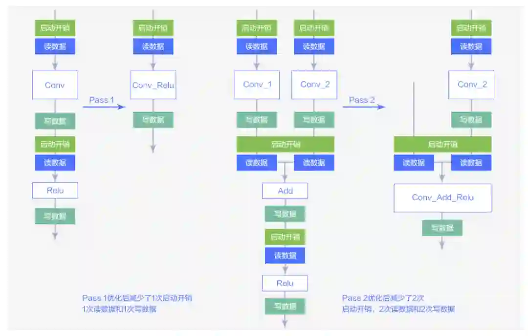 图 3 中的大方块表示图中各种算子,小方块表示这些算子的读/写数据操作以及启动开销。从图中可以看到经过算子融合的优化可以有效减少算子的读/写数据的操作以及启动开销。
