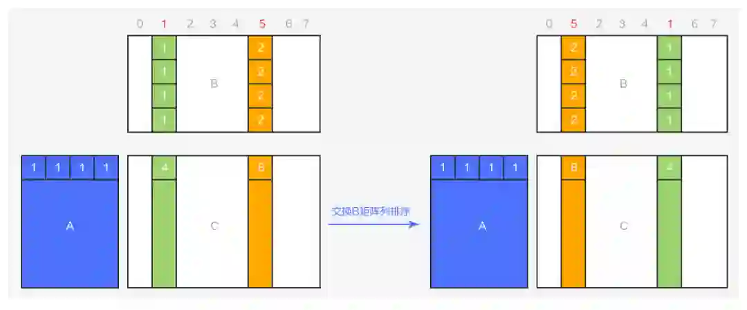 这样的输出OC 维度和线程对应关系。那么就只需要在线程内部进行数据打包和写回,并且 16 个4 bits 的数据正好占用 2 个32 bits 大小的空间,非常规整。要实现这个效果也是非常简单的:对于 AxB=C 的矩阵乘法,要实现 C 矩阵的列顺序变换,只需要对 B 矩阵进行对应的列顺序变换即可,如下图所示:
