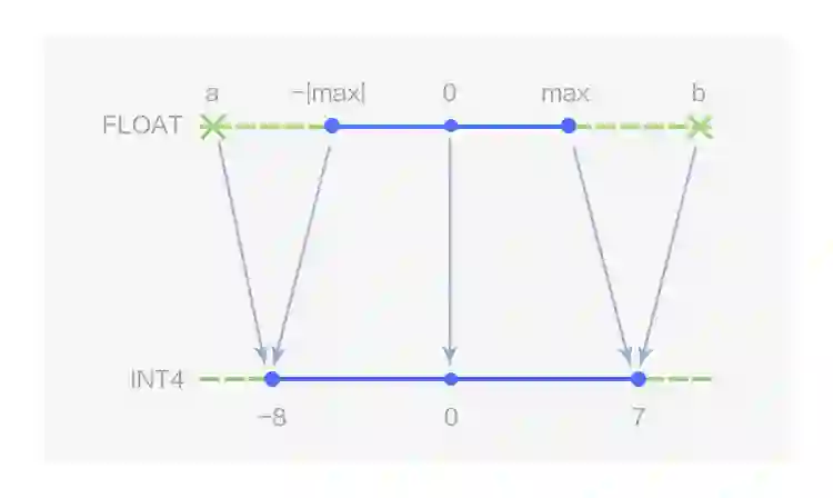 如图 1 所示,MegEngine 用数据类型 UINT4 表示 4 bits 的非对称线性量化,量化值的取值范围为[0,15];当 Z 取 0 时即为对称线性量化,此时 4bits 量化值的取值范围为[-8, 7],在 MegEngine 中用数据类型 INT4 表示,如图 2 所示。