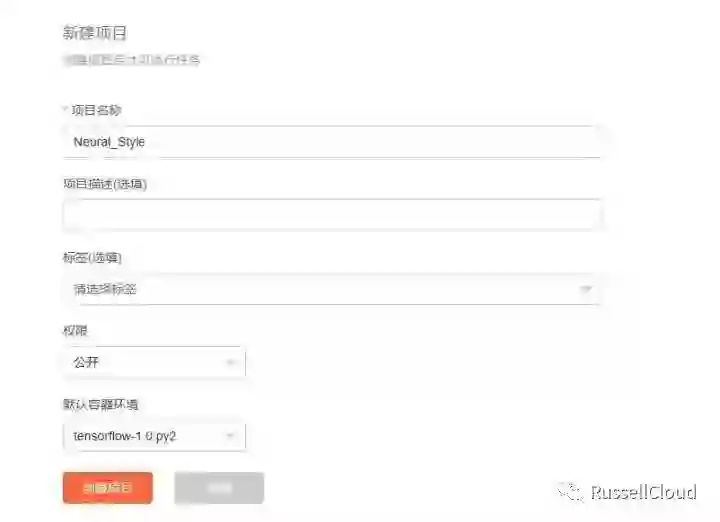 来到RussellCloud主页,进入控制台,新建一个项目。项目名随便起一个,很多都可以不填,比较重要的是默认容器环境一定要选择:tensorflow-1.0:py2 。