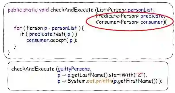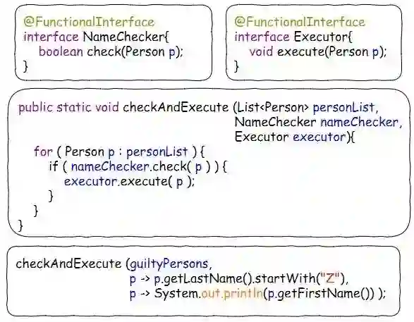 当然可以。在Java 8中有一个函数式接口的包,里面定义了大量可能用到的函数式接口(java.util.function (Java Platform SE 8 ))。所以,我们在这里压根都不需要定义NameChecker和Executor这两个函数式接口,直接用Java 8函数式接口包里的Predicate<T>和Consumer<T>就可以了——因为他们这一对的接口定义和NameChecker/Executor其实是一样的。