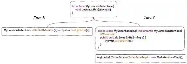 有些情况下,这个接口实现只需要用到一次。传统的Java 7必须要求你定义一个“污染环境”的接口实现MyInterfaceImpl,而相较之下Java 8的Lambda, 就显得干净很多。